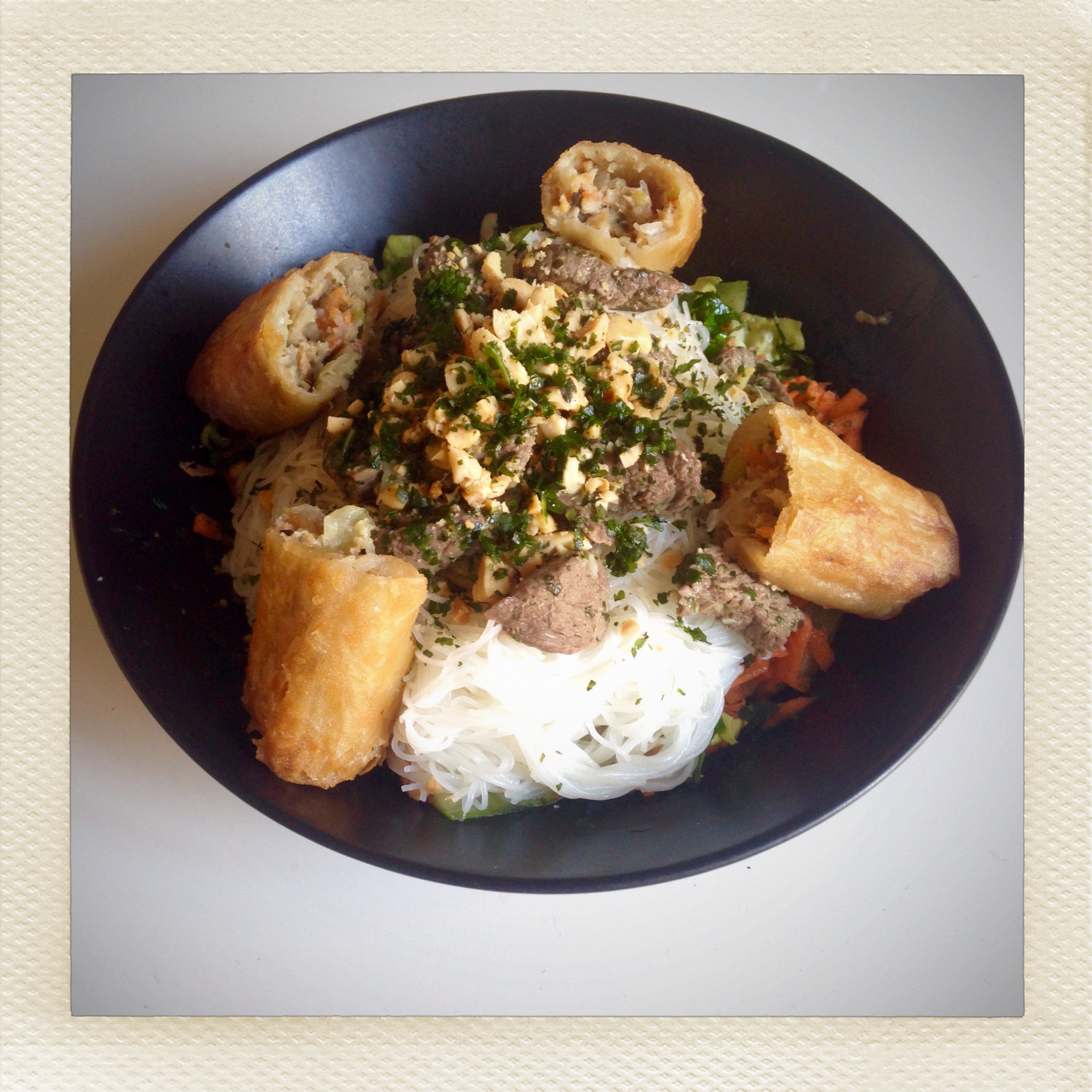 - Last but not least : le montage du Bo Bun. Prenez des grands bols ou des assiettes creuses. Commencez par mettre une poignée de salade dans chaque bol, puis le concombre et les carottes râpées. N’hésitez pas à mettre un peu d’herbes fraîches à ce moment là avant de continuer (comme sur la photo ci-dessous). Continuez avec les vermicelles, le bœuf encore chaud, et les nems coupés en deux. Arrosez le tout avec la sauce. Vous pouvez aussi mettre la marinade de la viande.