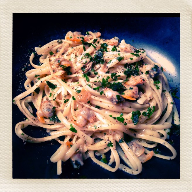La trêve des vacances estivales étant maintenant terminée 😦 Je vous propose avant le week-end une recette qui sent bon le soleil et la mer ! J’avais goûté un plat similaire aux bons vivants (mais avec des tagliatelles) et j’ai eu très envie d’essayer de le reproduire à la maison.