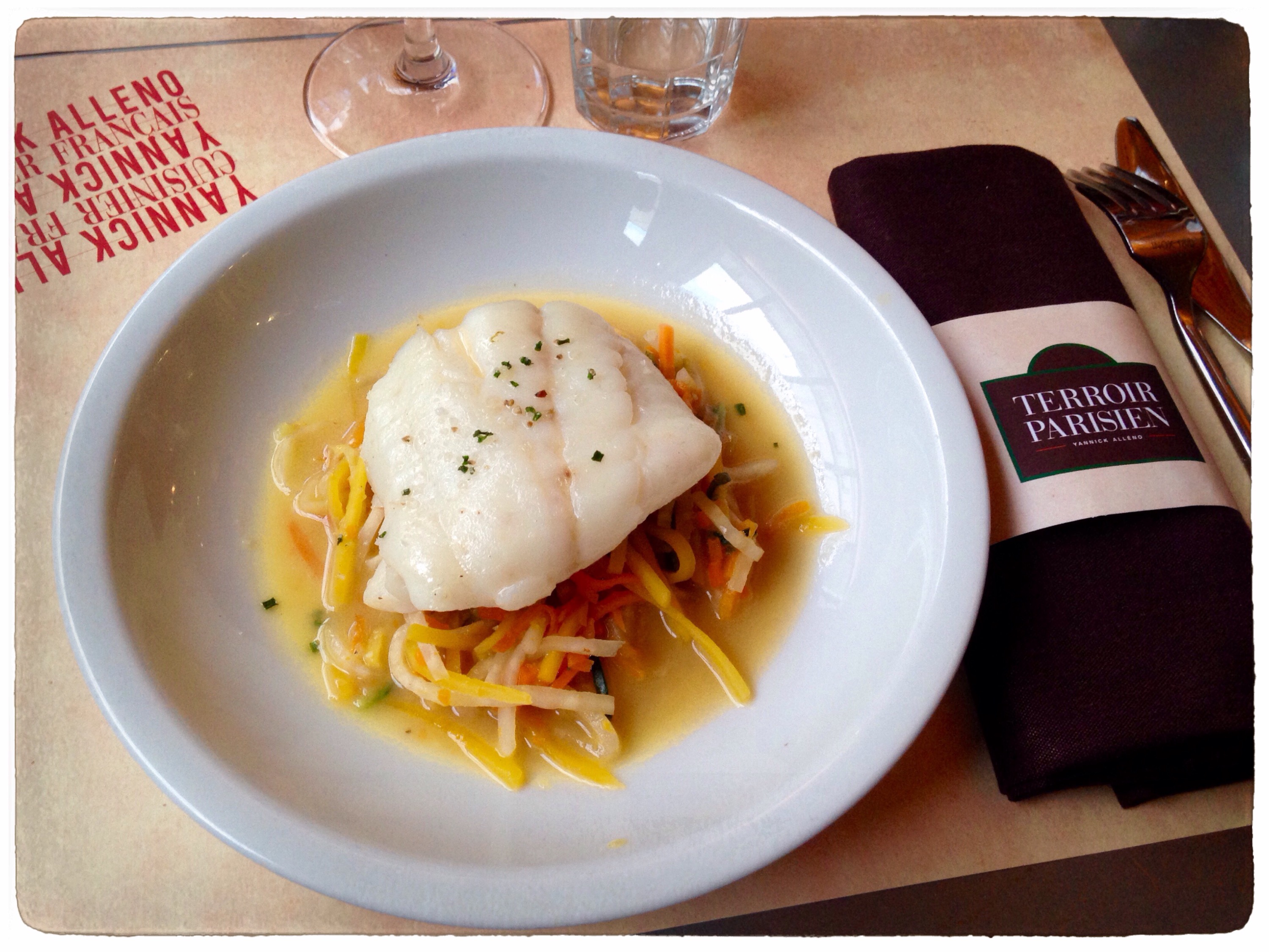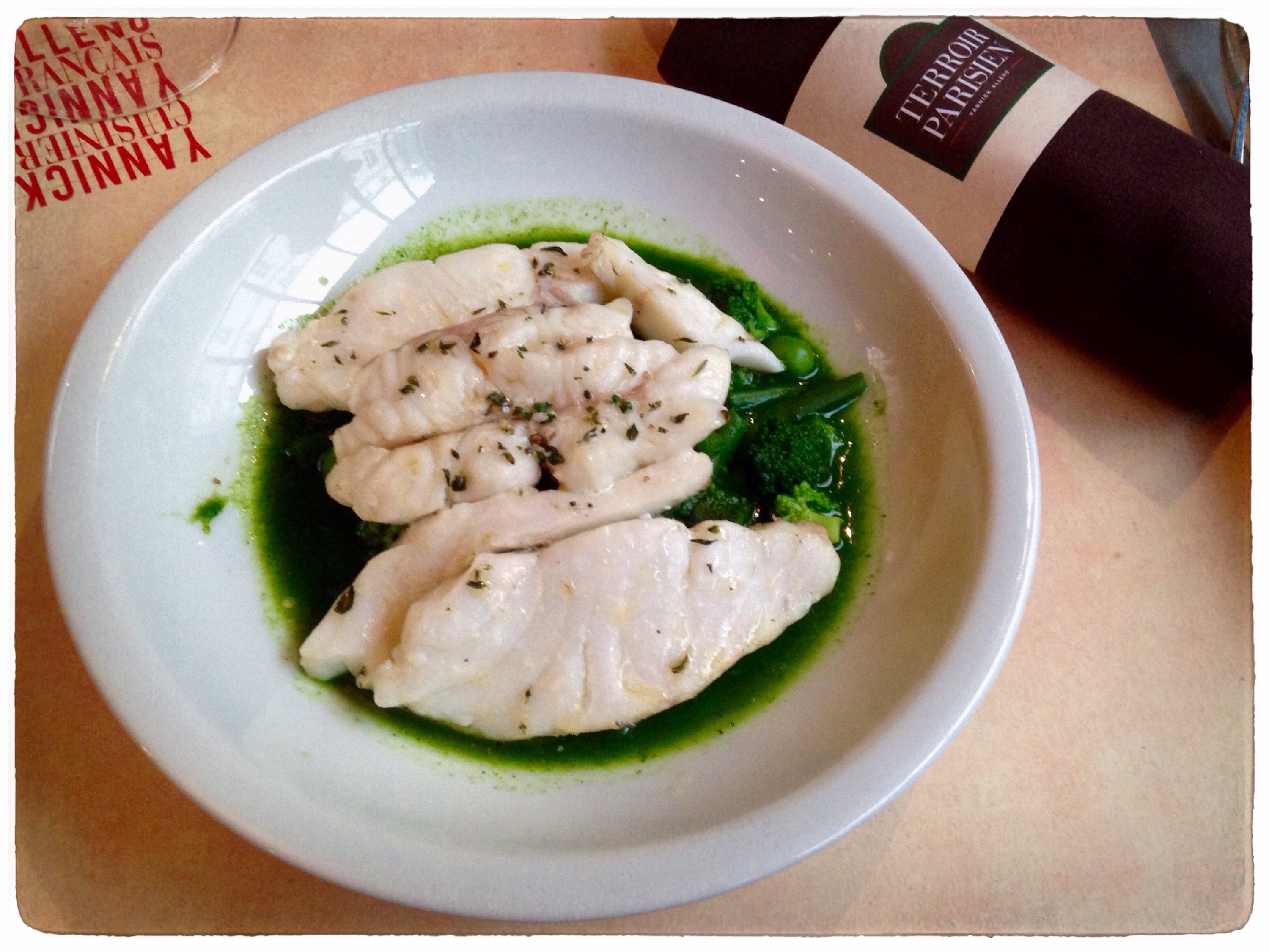 Le restau se trouve au sein de la Maison de la Mutualité, dans le 5ème arrondissement de Paris. La salle est organisée autour du bar (sur lequel on peut d’ailleurs dîner) ce qui apporte une ambiance plutôt conviviale. La décoration est simple mais élégante : on retrouve sur les murs les spécialités régionales écrites au feutre (Jambon de Paris, Asperges d’Argenteuil, Paris-Brest…) et les légumes de saison sont exposés dans des cagettes. Je craignais que l’endroit soit un peu pincé mais ce n’est franchement pas le cas. Et il n’y a absolument rien à dire sur le service.