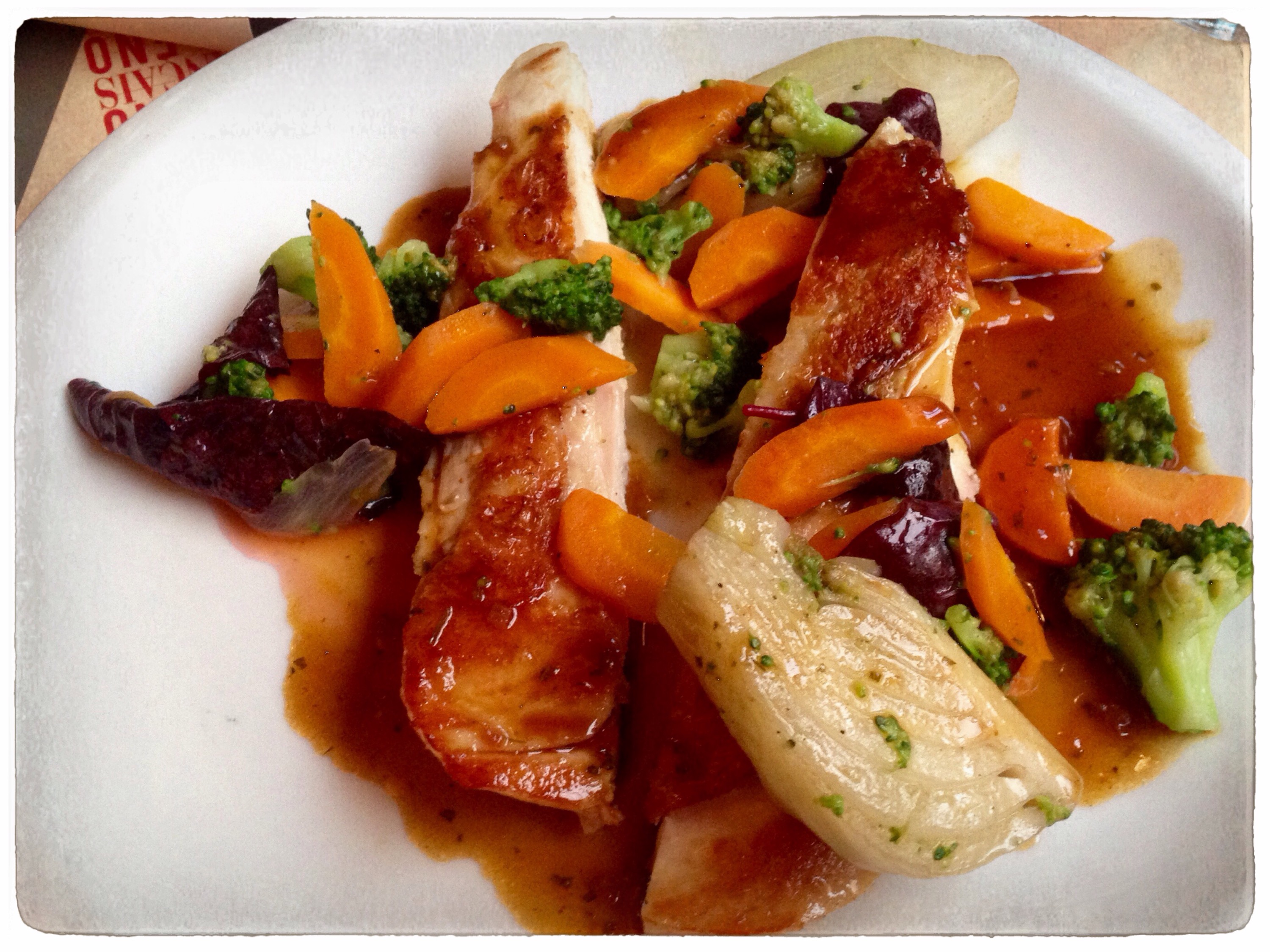 La carte intègre également un semainier pour mettre quotidiennement en avant un producteur d’Ile de France. Le lundi soir c’était le poulet de Birckel Solferino, servi avec des légumes à l’arroche rouge (18€). Très bon aussi.