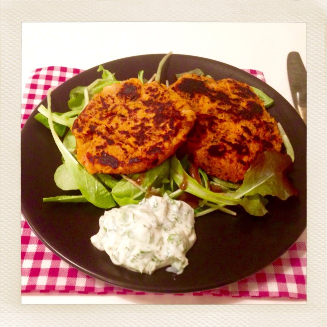 - Ciselez la coriandre et émincez le saumon. Ajoutez le saumon à la purée de patate douce, avec la chapelure et la moitié de la coriandre. Malaxez bien l’ensemble et façonnez quatre galettes.