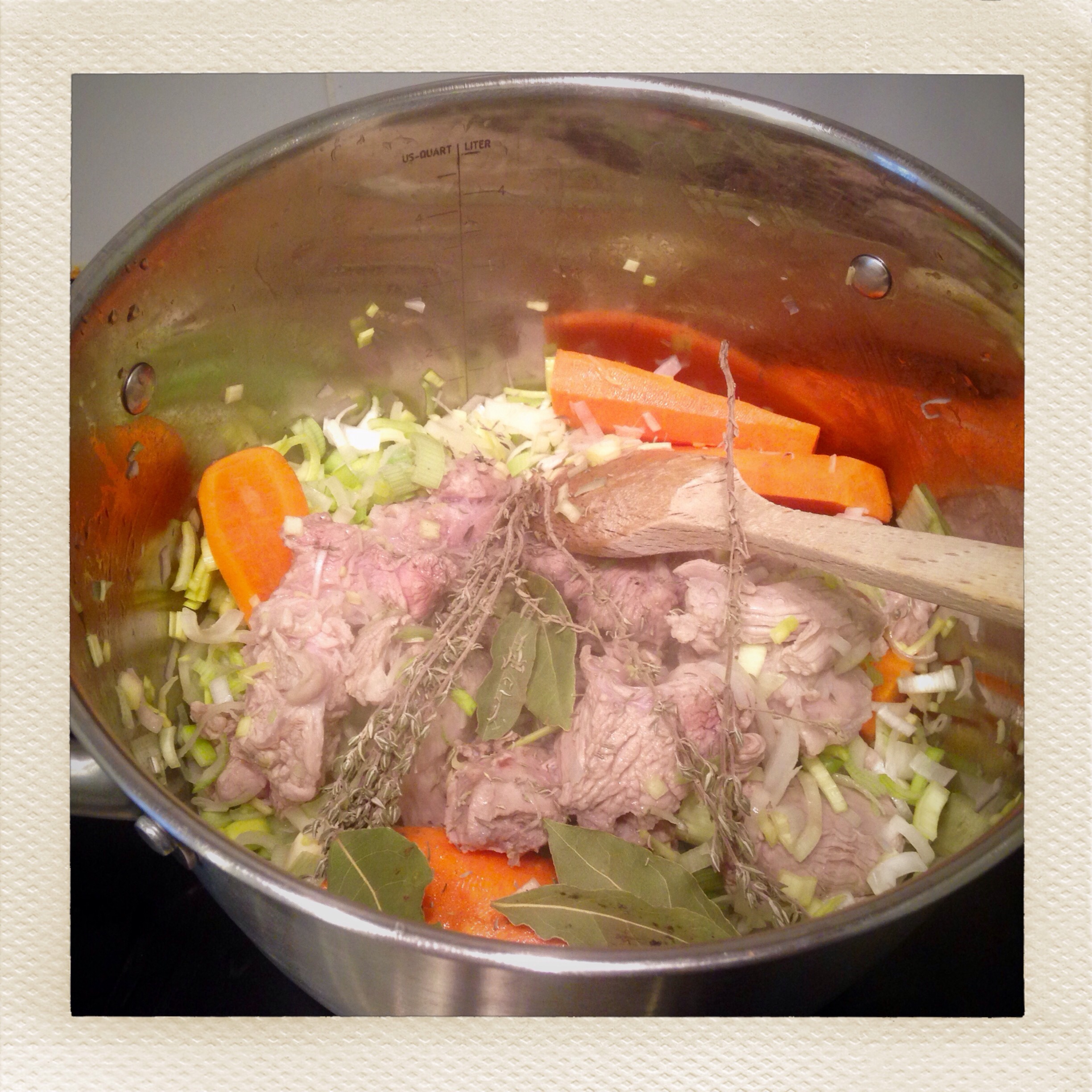 - Replacez la viande dans la cocotte rincée. Ajoutez l’oignon et les poireaux hachés, les carottes, les échalotes, l’ail et le bouquet garni.