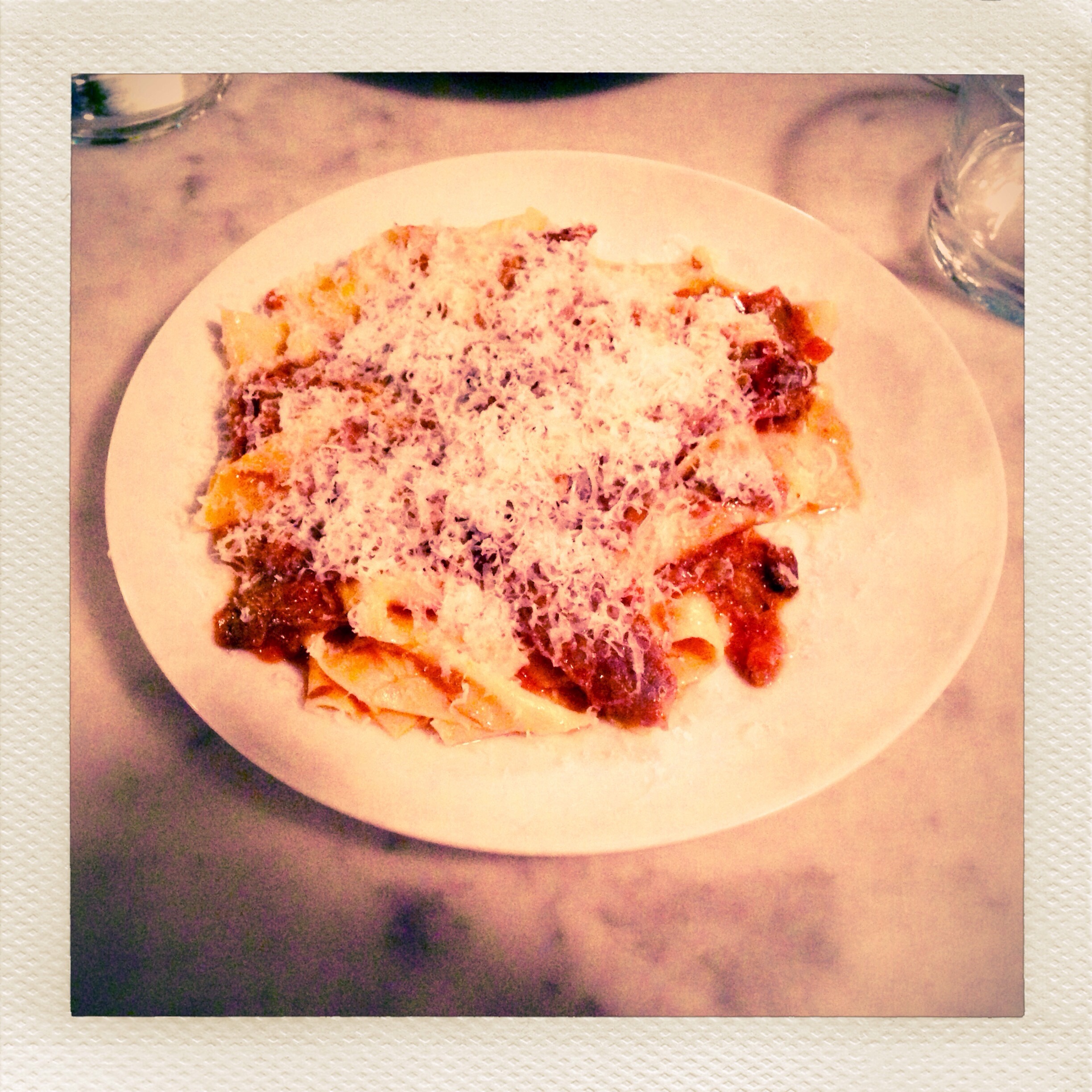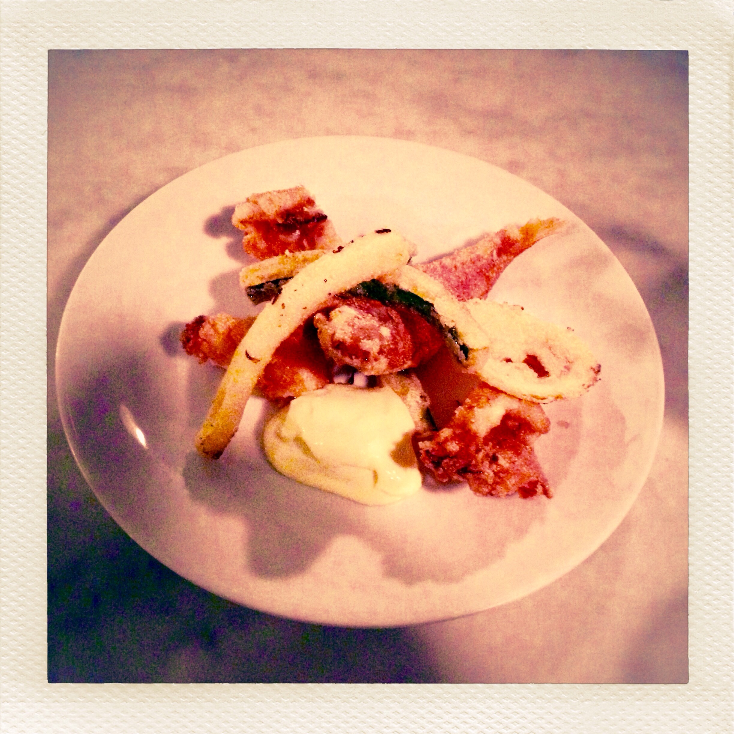 Nous avons débuté le dîner par deux entrées. La première c’était un plat de pâtes fraîches maison (réalisées le matin même par les cuisiniers du restaurant) accompagnées d’une sauce à la tomate, au canard et parsemées de parmesan râpé. Je recommande vivement cette entrée aux amateurs de pâtes, il y a du level ! La deuxième entrée c’était une friture de rouget et de calamars, avec un aïoli (maison évidemment). Tout simplement excellent.