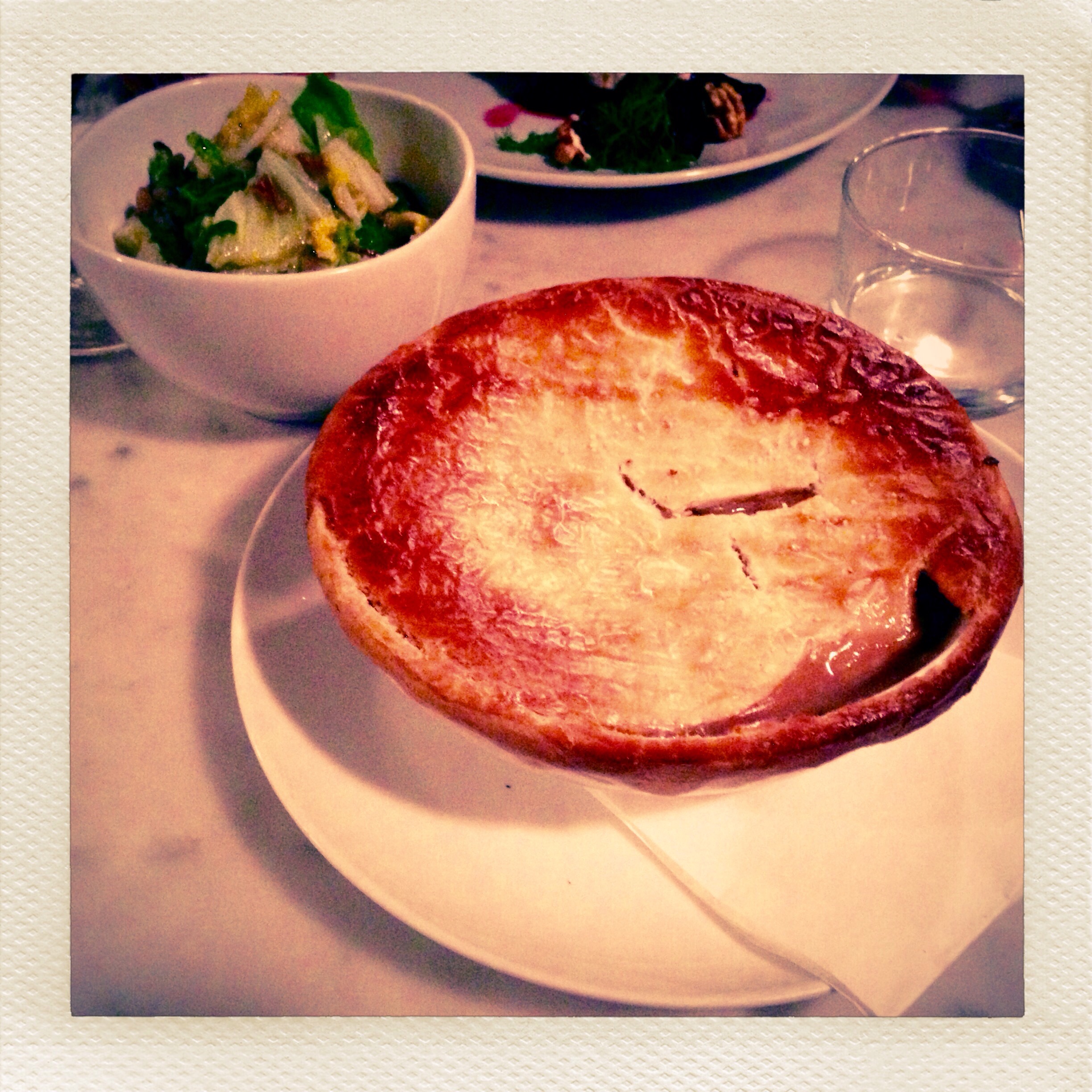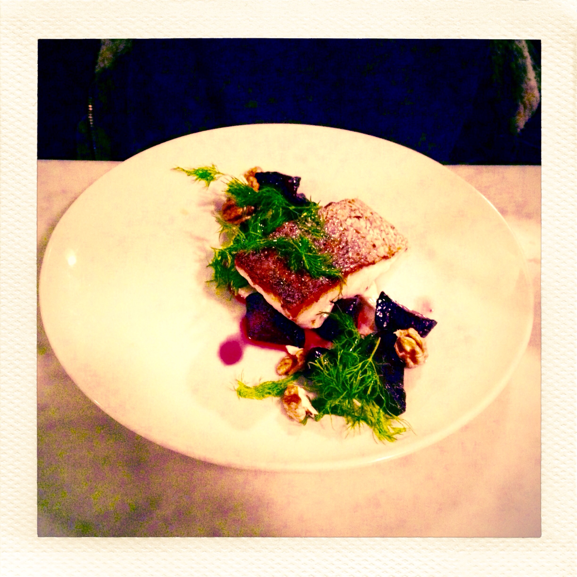 Nous avons poursuivi avec les plats. J’ai opté pour une tourte au faisan bien lisse et dorée (attention la garniture de la tourte est brûlante), accompagnée d’un petit bol de choux chinois cuisiné avec des châtaignes. La sauce est parfaitement relevée, la viande est tendre et pas forte du tout contrairement aux a priori que l’on pourrait avoir sur le faisan (la chair est semblable à une viande blanche). J’ai beaucoup, beaucoup aimé ! J’ai aussi testé le filet de maigre accompagné d’une sauce au yaourt et noix, et de betteraves caramélisées. Le poisson était très bien cuit et préparé ; les betteraves étaient croquantes et moelleuses à l’intérieur. Une nouvelle réussite !
