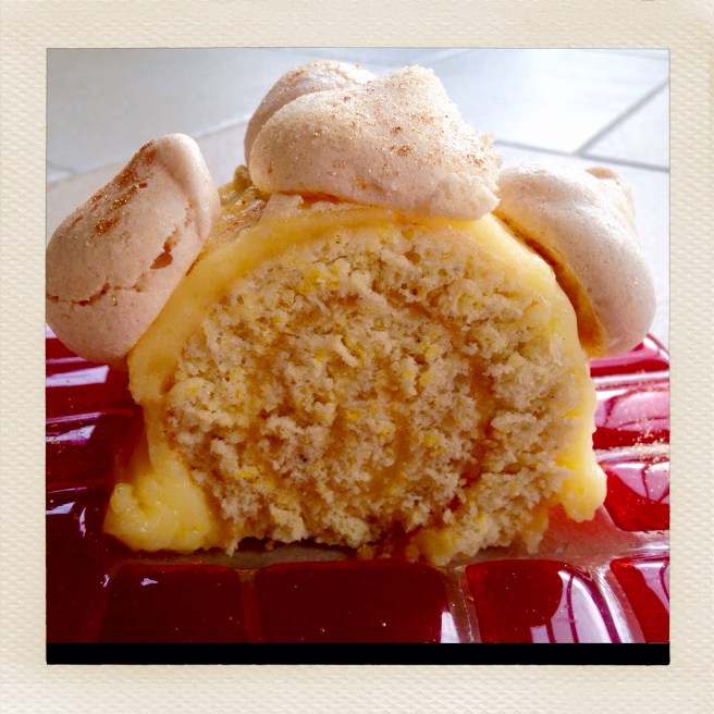 - Recouvrez entièrement la bûche de lemon curd, puis décorez-la avec des meringues sur le dessus et les côtés de la bûche.