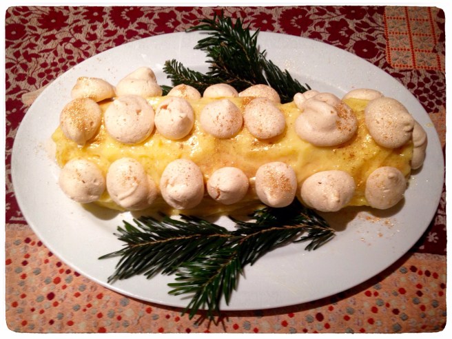 On a réalisé la bûche collectivement : ma mère a confectionné les petites meringues, ma sœur a trouvé l’idée et a réalisé la première partie de la recette, puis j’ai pris le relais sur la deuxième partie. Au final notre bûche a fait sensation ! On retrouve le goût acidulé du lemon curd, le croquant des meringues, et tout ça sous forme de bûche parce que bon, c’est Noël quand même 🙂